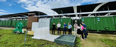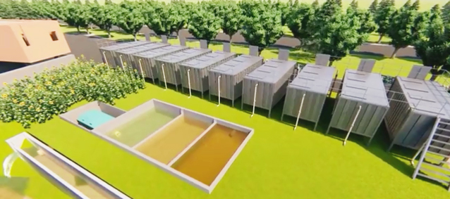 集裝箱式養(yǎng)殖系統(tǒng)采用 20 呎定制化“集裝箱”,尺寸是 6.1 米 *2.4 米 *2.8 米,養(yǎng)殖水體 25 立方米,占地面積為 15 平方米 ,配有納米增氧管(增氧)、出魚(yú)口(收魚(yú))、集污槽(排污)、天窗(觀察投喂飼料)、固液分離器(尾水處理)等功能構(gòu)件。